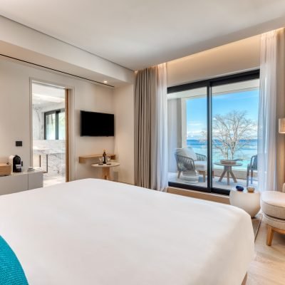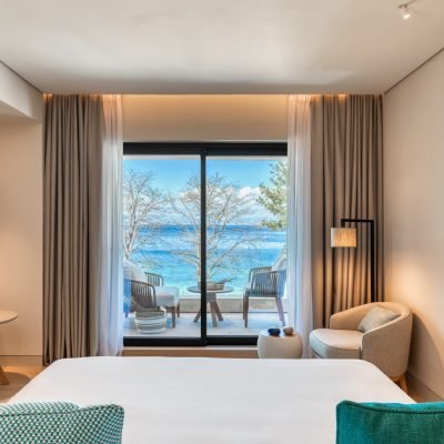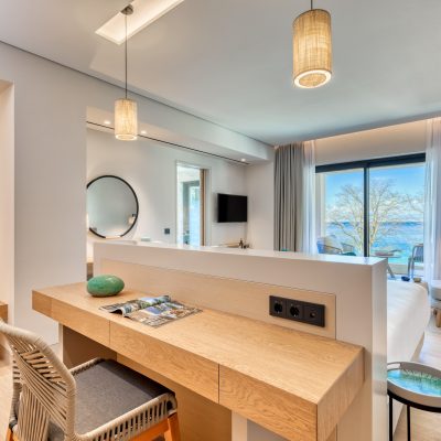 The rooms are divided into 3 suites, 2 triple rooms, 22 double rooms, as well as 2 rooms for people with limited mobility. The building is developed on 3 floors with a total covered surface of 1,175.51 m2 and a built surface of 2,618.96 m2.The hotel building consists of a ground floor and 2 floors with a total surface of 2618.96 m2. The building houses all the services provided by the hotel, the main and auxiliary areas, as well as the rooms (spa, massage facilities, sauna, 6-instrument gym, bar directly communicating with the outdoor, heated swimming pool area, pool changing rooms, individual swimming pools, kitchen-cooking facilities, restaurant, main public areas, reception, lounge, living room, telephone and internet access, partially covered outdoor terrace with pergola and with unobstructed sea view, breakfast preparation facilities, cleaning facility, linen room etc.) Moreover, the hotel is equipped with all modern E/M facilities required for its operation (water supply, sewerage, LPG, drinking water drilling, fire extinguishing equipment, biological treatment unit, desalination plant, air conditioning, ventilation, high current wiring, lighting, BMS, LMS - KNX, elevators, telephones - data, Wi-Fi & Ethernet, TV, CCTV, alarm system, sound systems, addressable fire detection system, etc.).