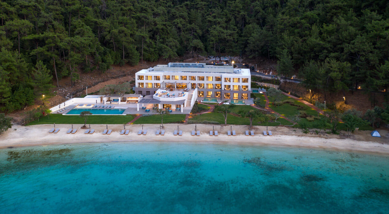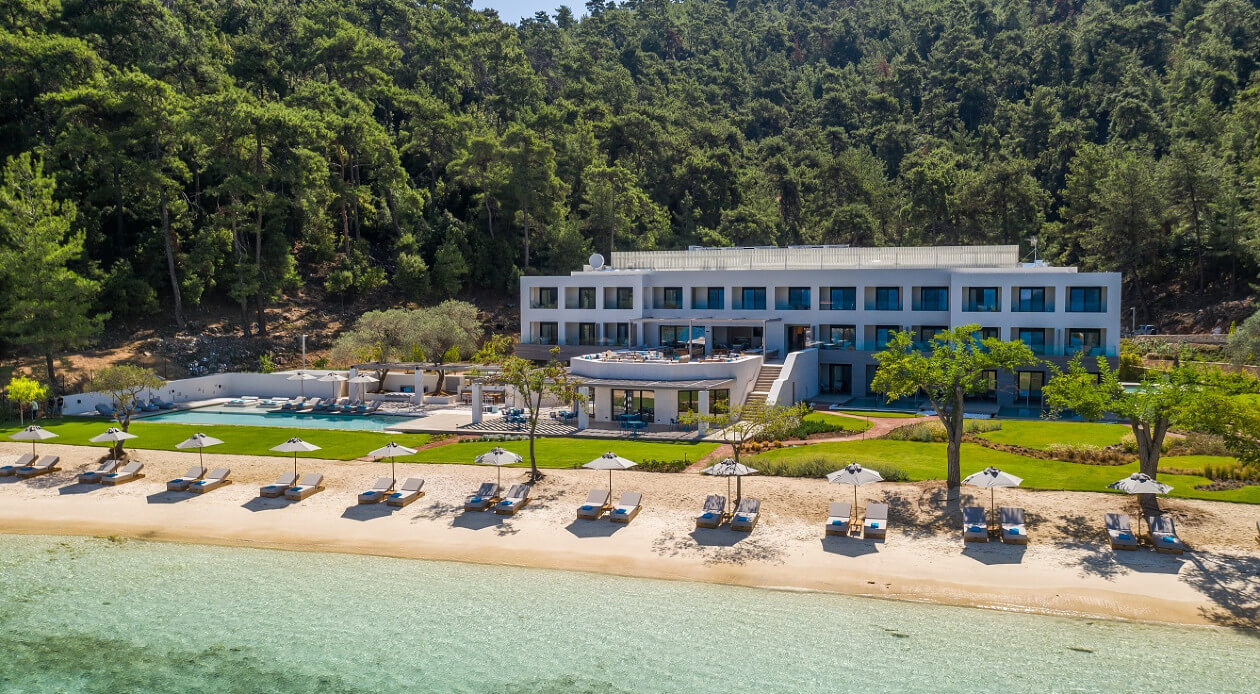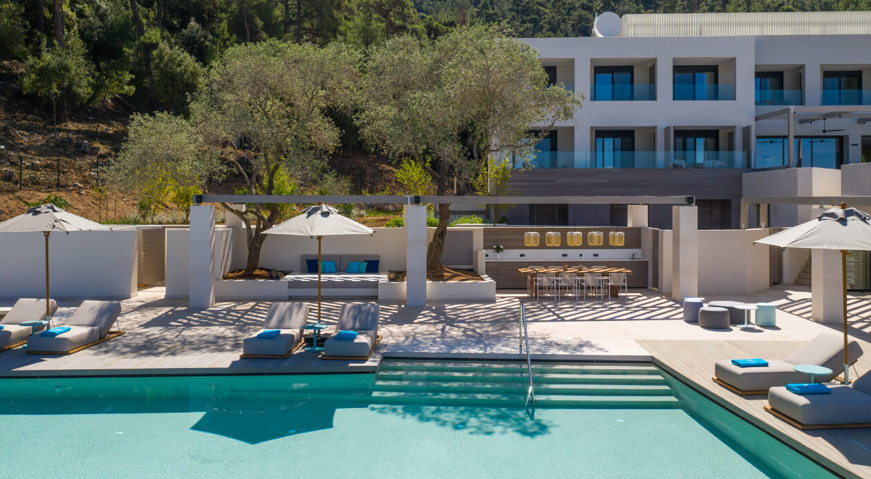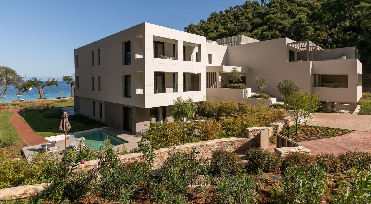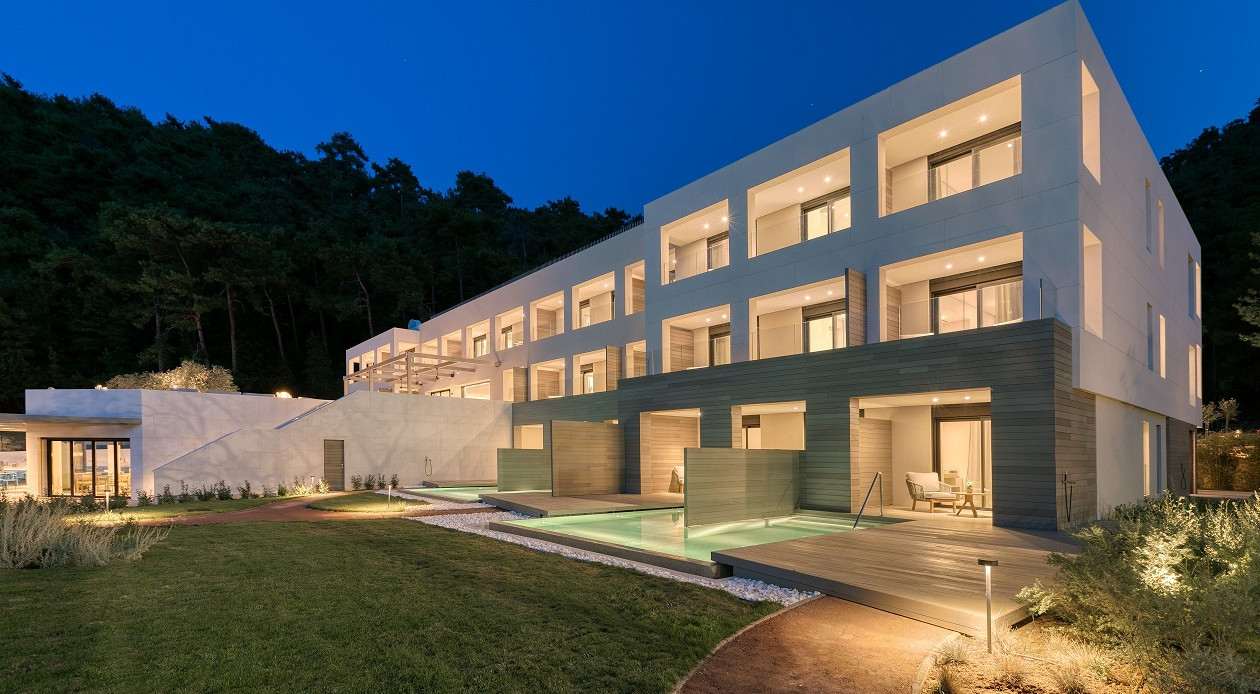 The project involves interior arrangements, modification of facades, addition of galleries and projecting roof, landscaping and construction of swimming pools in an existing building, to be transformed into a 5-star hotel, in a land parcel outside town planning, at Vathi, Port of Thassos, in the municipality of Thassos, Regional Unit of Kavala. The hotel offers year-round accommodation with a capacity of 57 beds - 30 keys.